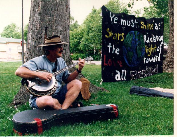 Mike Moxcey playing at a Baha'i Race Unity Day Picnic in Fort Collins, CO, USA. Banner says